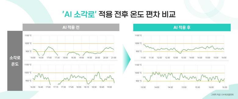 | ▲AI가 소각로 온도·압력 등 데이터를 분석 및 학습해 폐기물 투입 최적 시점을 안내한 결과 소각로의 온도 변화 편차가 AI 적용 전 대비 현저히 줄어든 것을 확인할 수 있다.<자료제공=SK에코플랜트> |