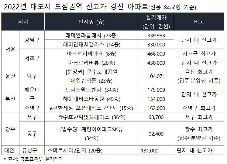 실제, 해당 대도시 도심 아파트 중 올해 신고가를 경신하는 아파트를 어렵지 않게 찾아볼 수 있다. 서울 강남구에 위치한 ‘래미안라클래시’와 ‘래미안대치펠리스’ 전용 84㎡형은 올해 각각 33억9,983만원(23층)과 33억원(14층)에 거래되며 모두 신고가를 경신했다. 서초구 반포동에 ‘아크로리버파크’ 전용 84㎡형은 올해 1월 46억6,000만원(8층)에 팔려 서초구 최고가 아파트(전용 84㎡기준)로 등극하게 됐다.