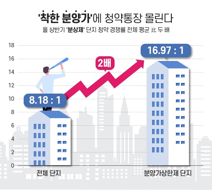 올해 상반기 전국에 분양된 분양가상한제 단지의 평균 청약 경쟁률이 17대 1 수준으로 나타났다. ‘착한 분양가’를 앞세워 분양에 나선 아파트에 청약통장 쏠림 현상이 심화되는 모습이다.