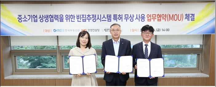 한국부동산원은 ㈜엠에스경영컨설팅, ㈜스텝투와 중소기업 상생협력을 위한 '빈집추정시스템 특허 무상 사용 업무협약(MOU)'을 체결했다고 18일 밝혔다.