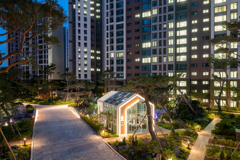 ‘숲과 빛의 풍경’은 달성파크 푸르지오 힐스테이트 조경공간으로 도심 속 자연을 모티브로 석가산, 폰드, 놀이 및 운동 공간에서 풍성한 녹음과 자연을 느끼며 다양한 경험을 유도할 수 있다. 단지의 입구 광장에 위치한 ‘송림 석수원’은 소나무 숲 속 바위, 물의 흐름을 강조한 공간이다. 글라스하우스와 조명 디자인이 어우러져 주간과 야간 모두 아름다운 경관을 감상하며 휴식할 수 있도록 조성했다. 모던한 미러 폰드 위에 떠있는 듯한 원형 파고라가 인상적인 ‘청담원’은 정원 속 휴게공간으로 고보라이트와 간접조명 등을 적용해 밤에도 매력적인 공간으로 조성했다.