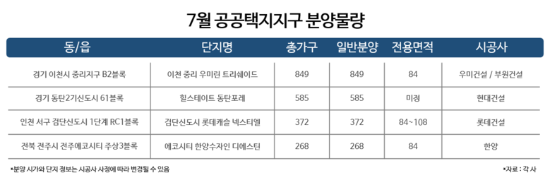 업계 조사에 따르면, 7월 분양하는 공공택지 신규 분양 아파트는 4개단지 총 2,074가구다. 수도권에서는 경기 이천, 동탄2신도시에서 3개 단지 1,806가구가 공급되고, 지방에서는 전북 전주시 전주에코시티에서 1개 단지 268가구가 공급된다.