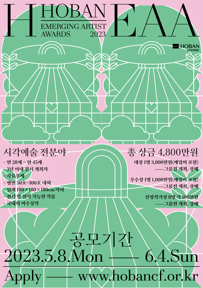 호반그룹의 호반문화재단은 2023 전국청년작가 미술공모전 ‘2023 H-EAA;Hoban-Emerging Artist Awards’(이하 ‘H-EAA’)를 진행한다고 9일 밝혔다.