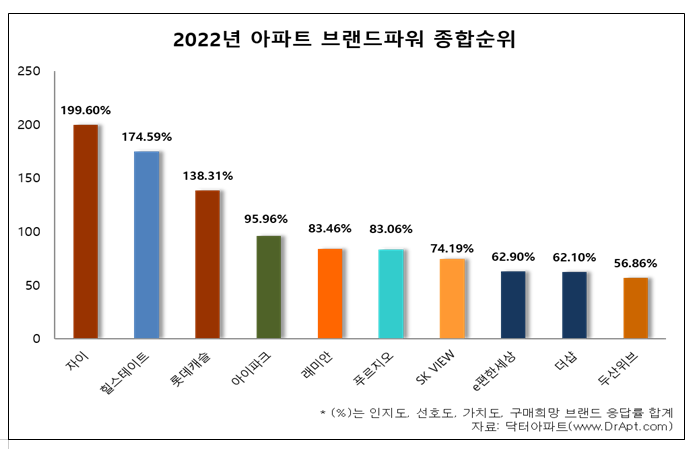 부동산 리서치회사 닥터아파트가 11월 7일부터 11월 13일까지 만 20세 이상 회원 2,248명을 대상으로 국내 도급순위 상위 50개 브랜드에 대한 2022 아파트 브랜드파워 설문조사를 실시했다.