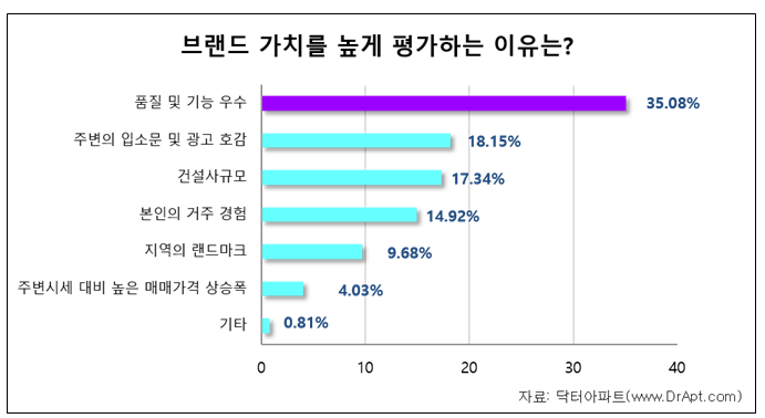 응답자들이 선택한 브랜드 가치를 높게 평가하는 이유로는 품질 및 기능이 우수하기 때문(35.08%)이라는 답변이 가장 많았다. 입소문 및 광고호감(18.15%), 건설사규모(17.34%), 본인의 거주 경험(14.92%) 등이 뒤를 이었다.