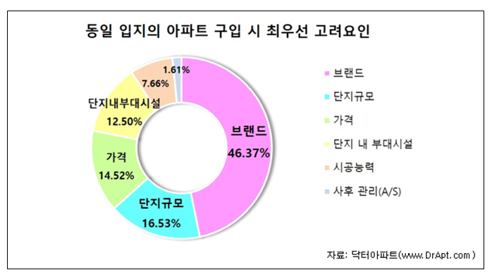 한편 동일한 입지에서 아파트 구입시 최우선적으로 고려하는 요인으로는 지난해에 이어 브랜드가 46.37%로 압도적 1위를 차지했다. 2015년 아파트 브랜드파워 설문조사를 실시한 이래 8년 연속 최우선 요인으로 선정된 것으로 보아 브랜드 아파트에 대한 수요자들의 높은 선호도와 신뢰가 두텁게 형성돼 있음을 다시금 확인할 수 있다. 뒤를 이어 단지규모(16.53%), 가격(14.52%), 단지내부대시설(12.50%) 등을 꼽았다.