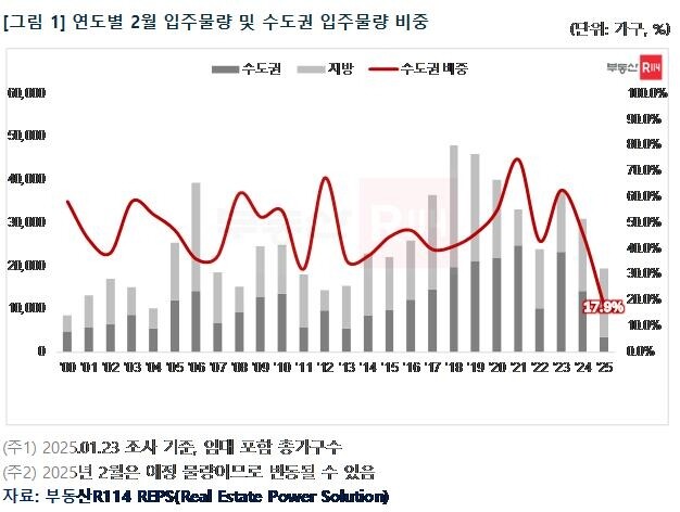 23일 부동산R114에 따르면 2월에는 전국 아파트 총 37개 단지, 1만9486가구(임대 포함 총 가구수)가 집들이를 시작한다. 수도권의 입주물량은 3481가구로 전국 대비 17.9% 수준에 그쳤다. 이는 당사가 조사를 시작한 2000년 이후 2월 기준으로는 가장 낮은 수준이다.