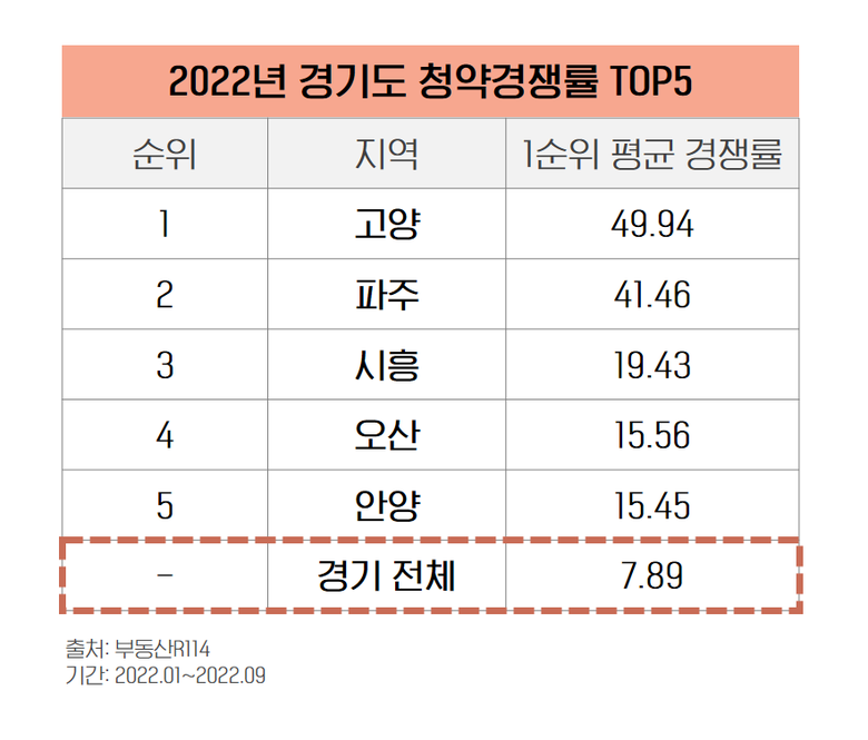 이처럼 경기도 청약 시장이 주춤한 가운데 일부 지역은 여전히 두 자릿수 경쟁률을 기록하고 있다. 고양과 파주가 각각 49.94대 1, 41.46대 1의 경쟁률로 40배수를 넘기며 경기도에서 가장 높은 평균 경쟁률을 기록했는데, 특히 파주는 13.19대 1을 기록한 전년 동기 대비 약 3배 상승하는 이례적인 모습을 보였다. 이 외에 시흥시(19.43대 1), 오산시(15.56대 1),안양시(15.45대 1)등이 상위 5위권을 차지했다.