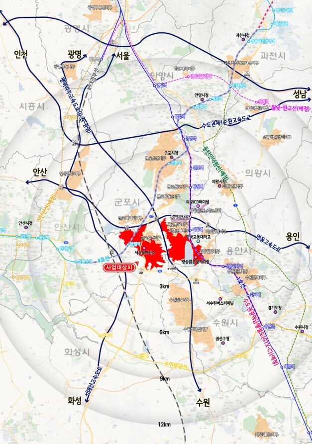 특히 3개 지자체에 걸쳐 있는 지리적 특성과 서부권 광역급행철도(GTX-C) 의왕역(예정) 등 우수한 교통 여건을 고려해 '콤팩트 앤 네트워크 시티(Compact & Network City)라는 개발방향을 목표로 수도권 서남부지역의 새 거점도시로 조성한다는 방침이다.