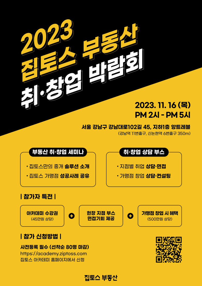이 날 박람회에서는 집토스 각 지점의 대표들이 모여 부동산 창업 및 소속공인중개사로서의 취업에 대한 장단점과 노하우를 솔직하게 녹여낼 계획이다. 참가자를 대상으로 현장에서 부동산 창업 컨설팅과 소속공인중개사 현장 면접의 기회도 제공되니, 부동산 중개업에 관심을 가지고 있는 사람들에게는 좋은 기회가 될 것으로 보인다.