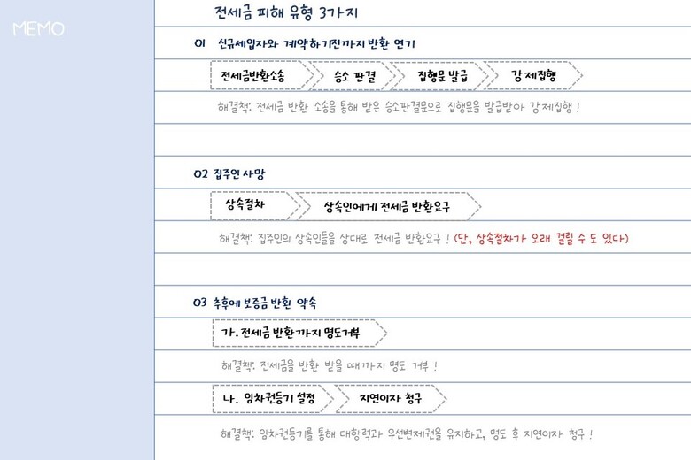 현실에서 가장 많이 접하는 전세금 피해 유형은 신규 세입자가 들어올 때까지 집주인이 전세금반환을 미룬다는 것이다. 더 큰 문제는 세입자가 이를 믿고 하염없이 집주인에게 시간을 준다는 점이다.