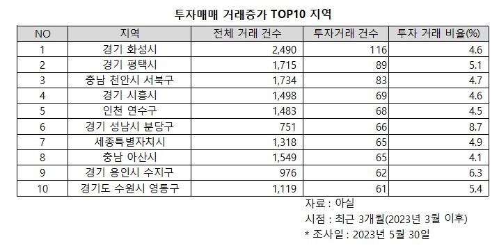 투자 매매 거래 증가 지역 TOP10 지역을 거래 건수가 많은 지역 순으로 살펴보면 ▲경기 화성시 116건 ▲경기 평택시 89건 ▲충남 천안시 서북구 83건 ▲경기 시흥시 69건 ▲인천 연수구 68건 ▲경기 성남시 분당 66건 ▲세종특별자치시 65건 ▲충남 아산시 65건 ▲경기 용인시 수지구 62건 ▲경기도 수원시 영통구 61건으로 조사됐다.