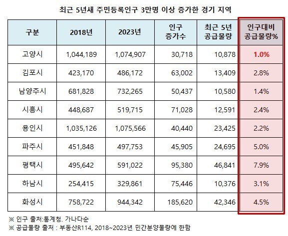 이 중 고양시의 경우 2023년 인구대비 공급물량이 1%로 가장 낮다. 인구는 1백만명이 넘었는데 최근 5년간 공급물량은 1만여 가구에 불과한 것이다.