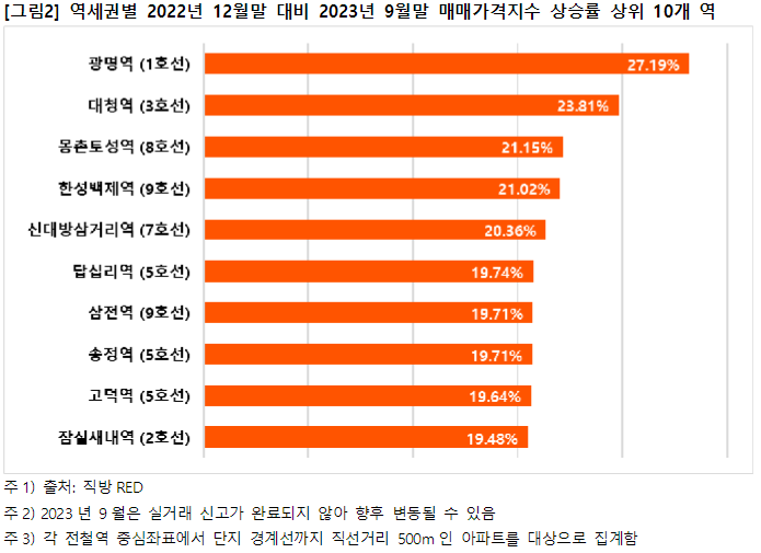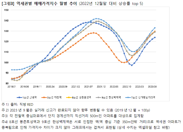 ② “역세권별 가격지수”는 각 전철역별 역세권에 소재한 아파트를 대상으로 가격지수를 집계한 것이며, 단지 경계에서 역까지 직선거리가 500m 이내인 아파트를 역세권으로 분류함. 단, 아파트 총세대수가 1,000세대 미만인 지역은 분석에서 제외됨.