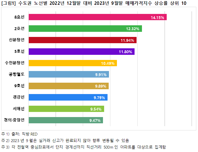 최근 청약시장에 나타난 양극화 현상 등을 살폈을 때, 입지나 단지 자체 경쟁력이 높은 아파트로 수요가 집중되는 현상이 강해지고 있다. 역세권은 전통적으로 수요자들이 선호하는 입지조건으로, 수도권 전철 중 어느 노선, 어느 역세권 아파트의 매매가격지수가 가장 많이 올랐는지 (주)직방이 분석했다.