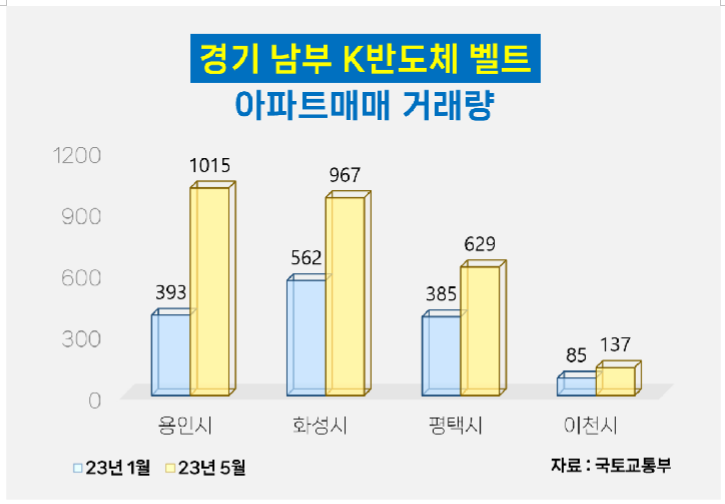 ‘경기 남부 K반도체 벨트’ 지역은 주택시장에서도 긍정적 시그널이 감지되고 있다. 아파트 거래량이 늘어난 것으로 나타났다. 국토교통부 자료에 따르면 올해 1월 대비 5월 아파트매매 거래량(6월 20일 기준)이 ▲용인시 393건→1,015건 ▲화성시 562건→967건 ▲평택시 385건→629건 ▲ 이천시 85건 →137건으로 거래량이 늘었다.