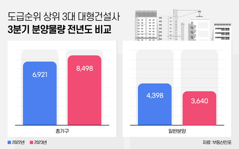 부동산시장 분석업체 부동산인포에 따르면 올해 3분기 도급순위 상위 3대 대형건설사들이 총 9개 현장에서 8,498가구를 분양할 계획이다(7월 기준). 이중 3,640가구가 일반분양 된다. 상위 3대 건설사는 각각 삼성물산, 현대건설, DL이앤씨다.(2022년 8월 1일~2023년 7월 기준, 도급 순위별) 지난 해 같은 기간과 비교하면 총가구는 약 1,500가구 가량 증가하나, 일반분양 가구는 약 750가구 정도 적다.