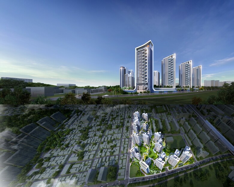 | ▲광주 동서작구역 재개발 정비사업 투시도(위쪽) 및 조감도.<사진제공=DL건설> |