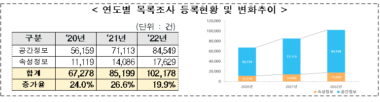 국토부는 국가공간정보 기본법 제30조(공간정보 목록정보의 작성)에 따라 고간정보를 생산하는 기관이 보유한 공간정보의 목록을 매년 조사해 발표하고 있다.
