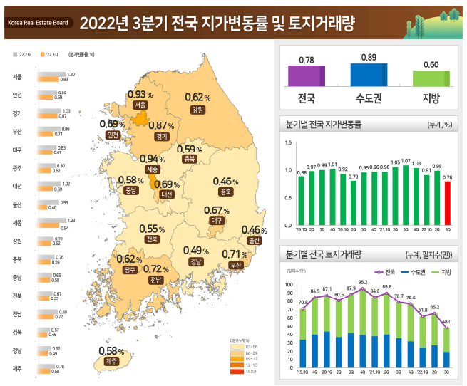 올해 3분기 땅값은 소폭 올랐지만, 상승폭이 5년 6개월 만에 가장 낮은 것으로 나타났다. 토지 거래량도 확연히 줄었다.