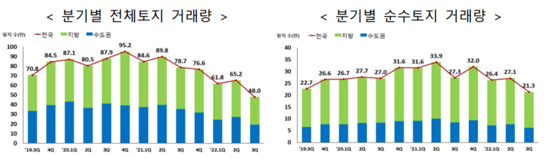 건축물 부속토지를 포함한 전체 토지 거래량은 3분기 약 48만 필지(383.1㎢)로, 1년 전보다는 39% 줄었고, 전분기 대비 26.4% 감소했다.