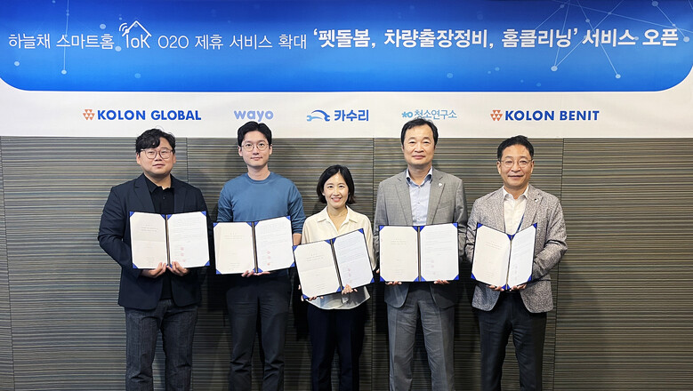 코오롱글로벌은 지난 22년부터 하늘채 입주민을 위해 코오롱그룹 계열사(BMW, FNC, 상사부문, LSI)의 차량, 의류, 홈케어 등과 관련된 다양한 O2O 서비스를 제공하고 있다. 코오롱글로벌과 코오롱베니트는 이번 서비스 확대를 위해 △주식회사 펫피플, △주식회사 카랑, △주식회사 생활연구소 3개사와 제휴 협약을 맺고 특화 서비스 개발을 추진했다.