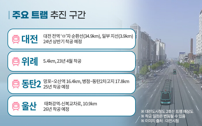 부동산인포 권일 리서치 팀장은 “실제 지상 위를 달릴 트램의 실사도 공개되고 있고, 친환경·고효율이라는 시대적 가치에 부합해 트램 조성 사례는 더욱 늘어날 것”이라며 “다만 지자체별로 트램 추진을 자금 조달 계획없이 공략으로 내건 경우도 있어, 트램 정차역 부근에 아파트를 분양 받는다면 실제 조성이 될 수 있는 여건인지 잘 따져 봐야 한다”고 말했다.