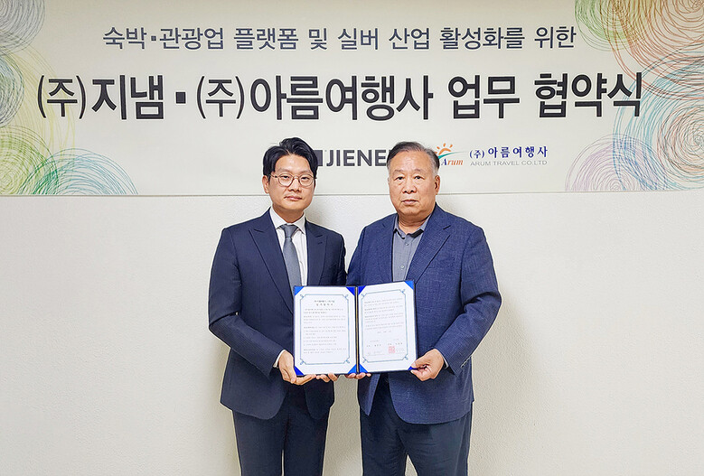 이번 업무협약은 지냄이 신규 사업으로 추진 중인 중장기 숙박 플랫폼과 아름여행사의 관광 플랫폼 간 API 연동을 바탕으로 상호 실질적인 협력을 통해 실버 세대 관광 활성화 및 레저 산업 성장을 도모하기 위해 추진됐다.