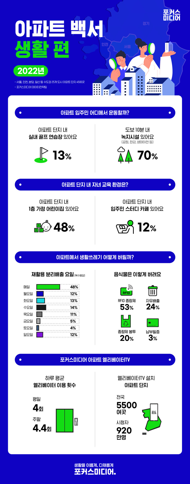 국내 1위 엘리베이터TV 기업 포커스미디어코리아가 2022년 서울, 인천, 분당, 일산 등 수도권 25개 도시 아파트 단지 4500여곳의 생활 편의 인프라를 조사한 '2022 포커스미디어 아파트백서: 생활편'을 1월 31일 발표했다.