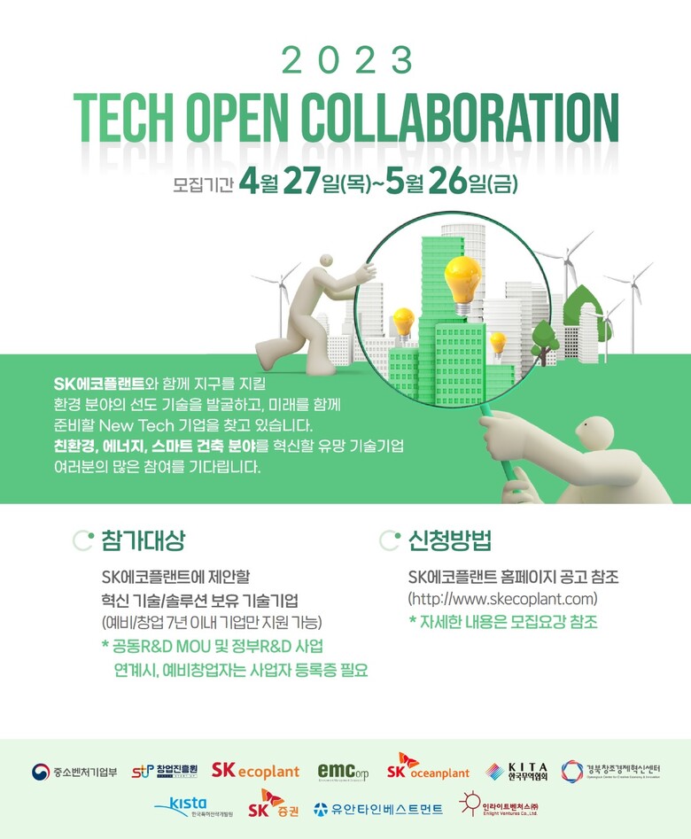 SK에코플랜트가 환경·에너지 분야 스타트업 혁신기술 발굴 및 공동개발을 위한 ‘테크 오픈 콜라보레이션(Tech Open Collaboration)’ 공모전을 개최한다고 27일 밝혔다.