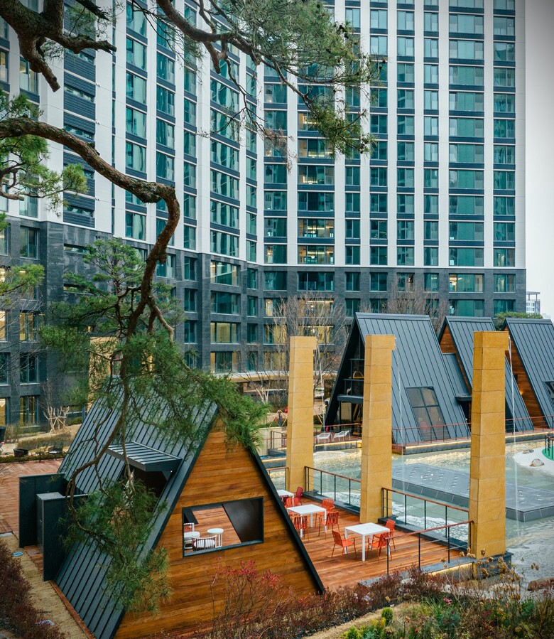 티하우스는 현대건설 자체 디자인으로 탄생했다. 자연을 모티브로 한 티하우스 디자인은 동화 속 오두막을 연상케 한다. 도심 속 자연 분위기를 연출하기 위해 우드 소재의 삼각 오두막 디자인을 채택했다. 티하우스 주변에는 수경시설과 식재가 조화를 이루고 있어 주변 경관을 즐기며 쉬어갈 수 있다.