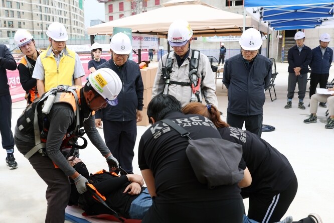 | ▲김헌동 SH공사 사장과 임직원들이 12일 SH공사가 관리하는 공동주택 건설현장에서 모의훈련을 진행하는 모습. 사진=SH공사 제공 |
