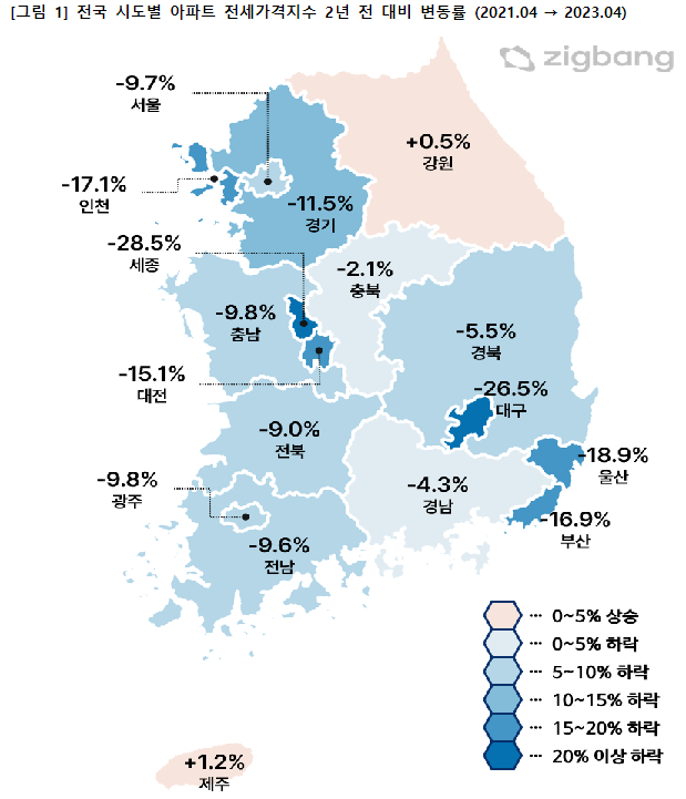 2023년 4월 기준, 전국 아파트 전세가격지수는 2년 전(2021년 4월) 대비 11.8% 하락한 것으로 나타났다. 지역별로 보면 전세가격의 하락세가 가장 컸던 곳은 28.5% 하락한 세종과 26.5% 하락한 대구였으며, 그 뒤로 울산(-18.9%), 인천(-17.1%), 부산(-16.9%), 대전(-15.1%) 순으로 하락세가 컸다. 일반 도 지역의 경우에도 전세가격이 지속 하락하고 있으나 대도시들에 비해 상대적으로 변동폭은 작았다. 특히 강원과 제주는 변동률이 각각 +0.5%, +1.2%로 나와 2년 전 가격 수준까지 떨어지지는 않은 것으로 나타났다.