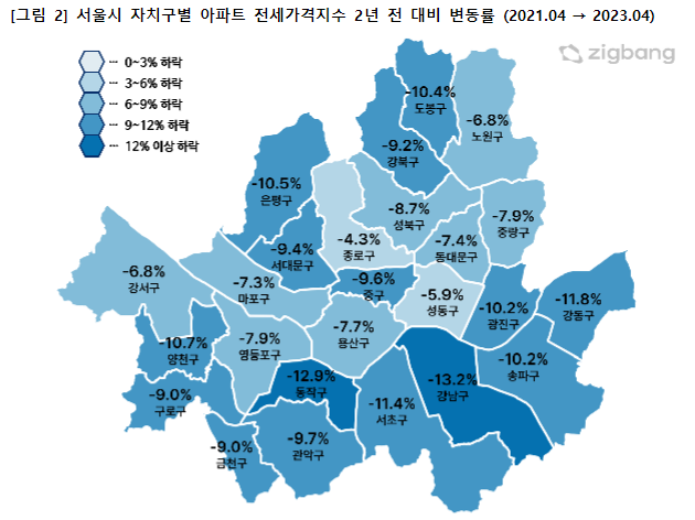 서울 자치구별 전세가격을 살펴보면 2023년 4월 기준 강남구와 동작구의 아파트 전세가격이 2년 전 대비 각각 -13.2%, -12.9%로 가장 크게 하락하였다. 권역별로는 북부권(노도강 지역)과 동남권(강남3구 지역)에서 대조를 이루었다. 강남3구의 경우 2019년 이후 2022년 상반기까지 연평균 10% 내외의 꾸준한 상승 추세를 보이다가 2022년 중순 이후 하락 전환하여 1년 동안 고점대비 15~17% 가까운 급격한 하락세를 보였다. 반면 북부권(노도강 지역)은 2020년에 급격한 전세가격 상승을 보인 이후 2년 간 보합세를 유지하다가, 2022년 하반기 들어 하락전환 되었으나 그 속도는 10~11% 내외로 동남권에 비하면 비교적 느린 하락세를 보였다. 한편 강북구, 송파구와 같은 일부 자치구는 2023년 3-4월 들어 반등이 시작되려는 조짐을 보이는 반면 서초구, 강남구 등의 자치구에서는 지속 하락하는 패턴을 보이는 등 최근의 동향은 자치구에 따라 엇갈리고 있다.