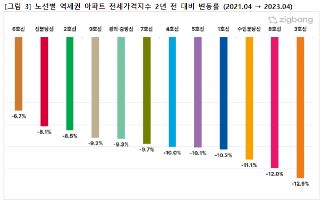 수도권 전철의 주요 노선별로 살펴보면 2023년 4월 기준 3호선 역세권 아파트의 전세가격이 2년 전 대비 12.9% 하락한 것으로 나타나 상대적으로 가파른 변동폭을 보였다. 반면 6호선(-6.7%)과 신분당선(-8.1%), 2호선(-8.5%)은 비교적 하락률이 낮은 것으로 나타났다. 이와 관련해 시계열 추이를 보면 서울 내 주요 업무지역을 지나는 2호선 역세권 아파트들의 전세가격 변동폭이 상대적으로 적었으며, 신분당선의 경우 전세가격 하락전환이 늦어 2022년 상반기까지 지속적인 상승을 보이다 2022년 하반기부터 하락이 시작되었기에 2023년 4월 기준 2년 전 대비 변동률은 상대적으로 낮게 집계되었다.