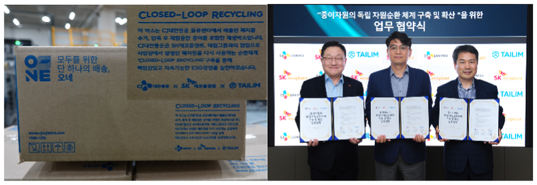SK에코플랜트와 CJ대한통운, 태림포장은 CJ대한통운의 물류센터에서 버려진 종이자원을 재생박스로 생산해 다시 CJ대한통운 물류센터로 공급하는 ‘완결적 자원순환체계(Closed Loop)’ 시스템을 구축하고 첫 시제품 생산에 성공했다고 15일 밝혔다.