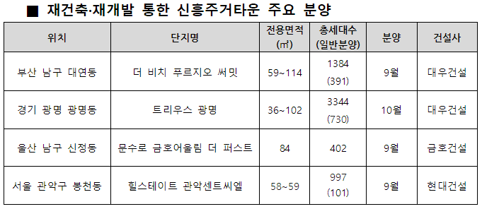 신흥주거타운은 재건축·재개발 정비사업을 통한 구도심 개발과 택지지구·도시개발사업을 통한 신도시 개발로 나눠볼 수있다.
