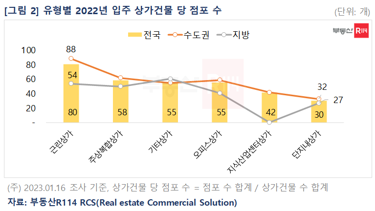 여러 점포가 한 데 모여 있는 상가건물이 예년 대비 늘면서 상가시장에도 ‘규모의 경제’가 부각되는 모습이다. 부동산R114(www.r114.com)가 자체 개발한 상업용 부동산 분석 솔루션 ‘RCS(Real estate Commercial Solution)’를 통해 전국의 상가 데이터를 분석한 결과, 2022년 입주한 상가건물 당 점포수는 58개(△상가 수 533개 △점포 수 3만1,140개)로 집계됐다. 이는 2021년 39개(△상가 수 847개 △점포 수 3만3,285개)에 비해 21개 늘어난 수준이며, 부동산R114가 조사를 시작한 2015년 이래 가장 많은 수치다.