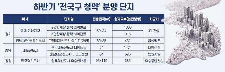 충남 내포신도시에서 대방건설이 ‘디에트르(RM14블록)’ 1474가구를 분양하고, 평택 고덕국제도시에서 금성백조가 ‘예미지(A48블록)’ 431가구를 선보일 계획이다.강원 원주혁신도시에서 유승종합건설이 386가구, 충남 내포신도시에서 동원개발이 696가구 분양도 계획돼 있다.