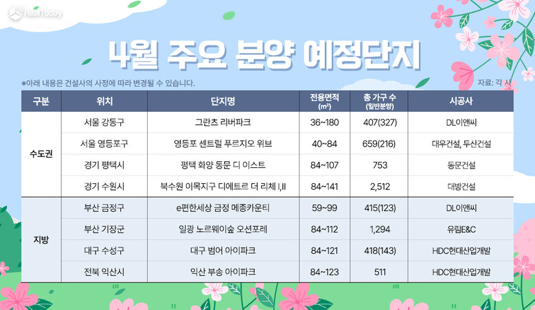 리얼투데이 관계자는 “3월 청약홈 개편으로 잠시 중단된 분양시장이 봄 성수기를 맞아 활기를 찾는 모습”이라며, “대국민의 관심이 4.10 총선에 집중돼 있는 만큼 총선이 마무리된 4월 중반을 기점으로 건설사들이 물량을 쏟아낼 것으로 예상된다”고 전했다.