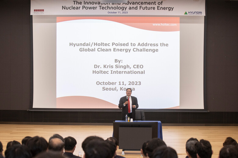 현대건설은 지난 11일 서울 종로구 현대건설 본사 대강당에서 ‘원자력 기술과 미래 에너지 분야의 혁신과 성장’을 주제로 홀텍 크리스 싱 회장의 특별강연을 실시했다. 이날 강연은 파트너사인 홀텍 관계자 초청행사의 일환으로 진행됐으며, 현대건설 임직원 외에도 한국원전수출산업협회, 한국전력공사, 한전원자력연료 등 원자력 관련 기관 및 협회와 두산에너빌리티, 포스코E&C, 현대제철 등 산업계, 학계 인사 등 400여 명이 강당을 가득 메워 美 원자력 석학의 이야기에 깊은 관심을 나타냈다.