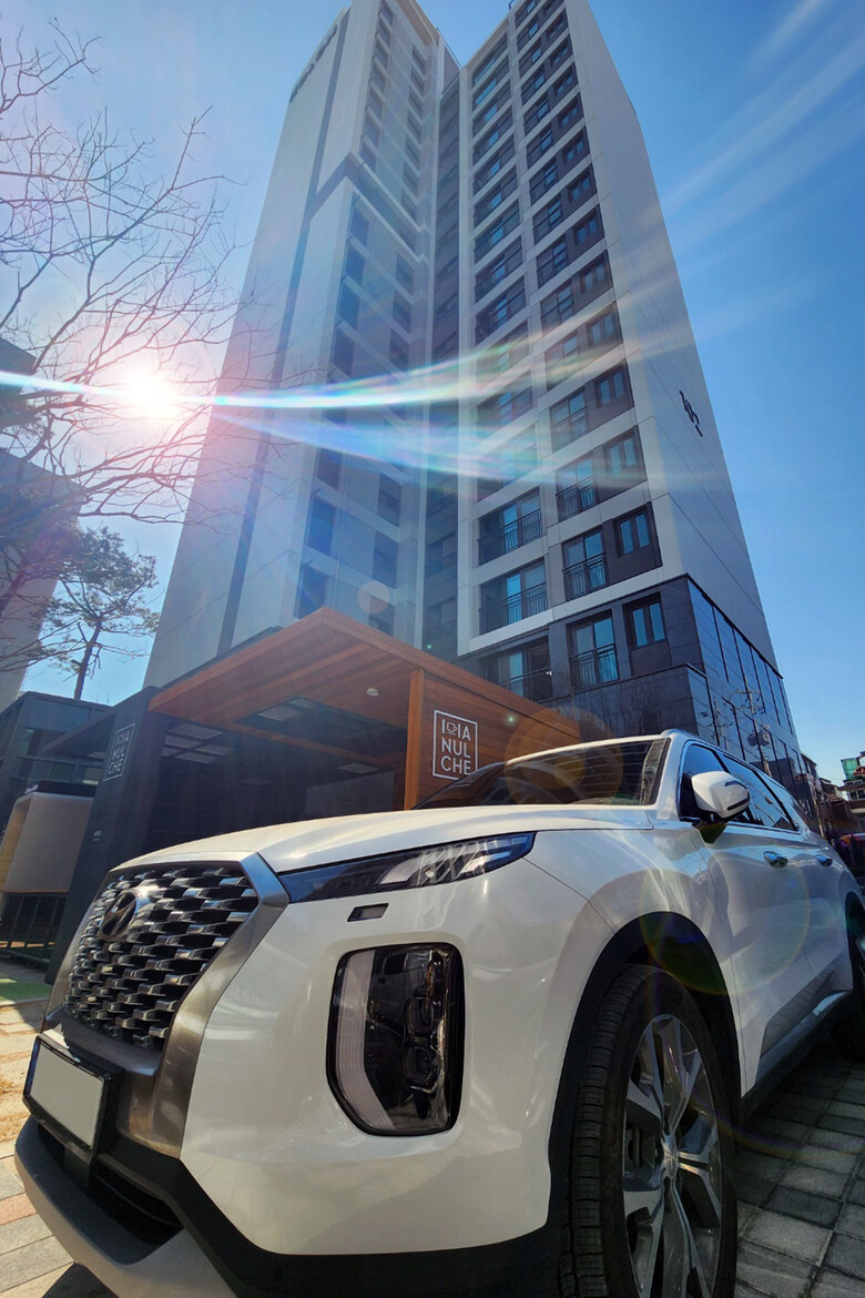 | ▲홈투카 서비스가 적용된 자양하늘채베르 단지와 현대 팰리세이드 차량<사진제공=코오롱글로벌> |