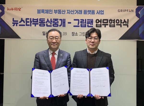 블록체인 컨설팅 전문기업 그립팬은 뉴스타부동산중개(주)와 블록체인 기반 부동산 자산거래 플랫폼 서비스 사업 공동추진을 위해 업무협약을 체결했다고 10일 밝혔다.