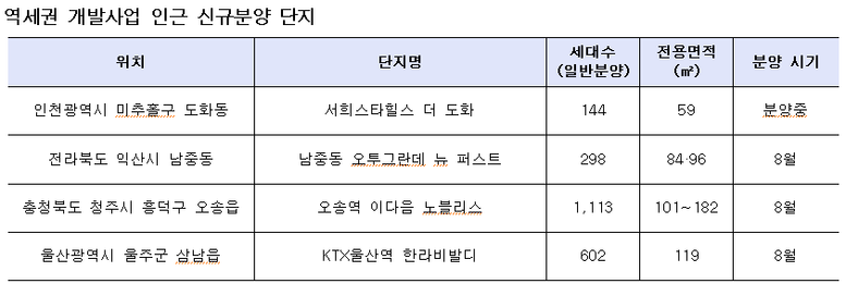 충북 청주시 흥덕구 오송읍에서는 ㈜서한이 8월 중 ‘오송역 이다음 노블리스’를 선보일 계획이다. 이 단지는 전용 101~182㎡ 총 1,113세대 규모다. 단지 인근에 KTX오송역세권 개발사업이 진행 중으로 2023년 말까지 약 70만6,000㎡ 부지에 공동주택과 유통·상업시설, 호텔, 영화관, 컨벤션센터 등을 갖출 예정이다.