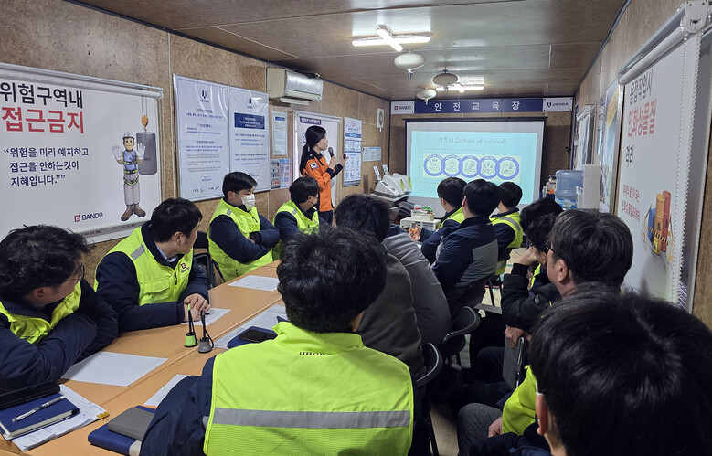 | ▲반도건설 현장 신규 입사자를 대상으로 CPR(심폐소생술)과 AED 교육 실시 사진<사진제공=반도건설> |