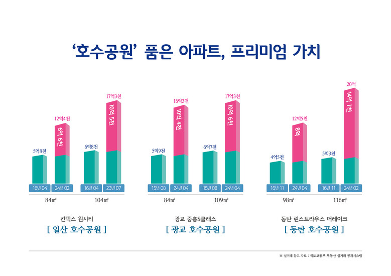 일산, 광교, 동탄 등 수도권에서 대표적인 호수공원이 자리한 지역에서 호수공원 인근 아파트는 부동산시장 불황에도 불구하고 월등히 높은 집값 상승세를 나타내고 있다.