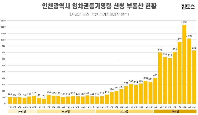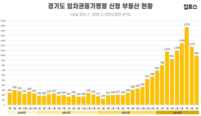 20일 부동산 중개업체 집토스가 2020년 7월에서 2023년 9월까지 법원 등기 정보광장의 임차권설정등기(임차권등기명령) 신청 부동산 현황을 분석한 결과, 전국의 법원 임차권등기명령 건수가 2022년 7월 1,059건을 돌파하였고, 1년 뒤인 2023년 7월에 6,165건으로 482% 상승하였다. 해당 건은 임차권설정등기 신청 후 등기가 이미 완료된 건들만 취합한 수치이다.
