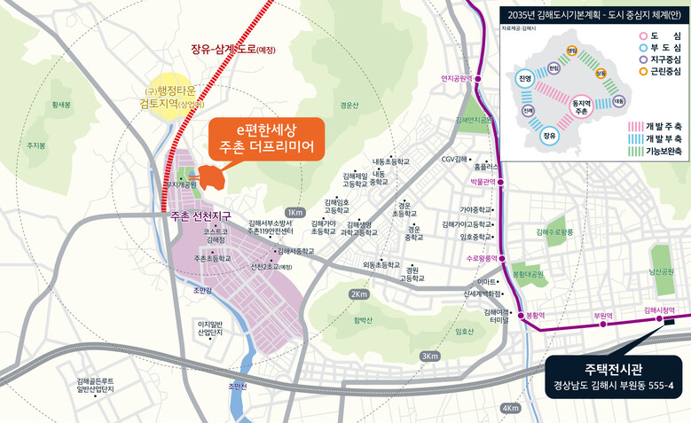 e편한세상 주촌 더프리미어가 들어서는 주촌면 일대는 김해시가 발표한 ‘2035 김해도시기본계획’에 따라 향후 김해시를 대표할 중심지 역할을 할 전망이다. 현재 주촌선천지구와 그 주변으로약 9,200여 가구가 공급돼 있고 향후 e편한세상 주촌 더프리미어 등 4,300여 가구가 추가로 들어서면 일대는 총 1만3,000여 가구의 대규모 신흥 주거타운으로 거듭나게 된다.