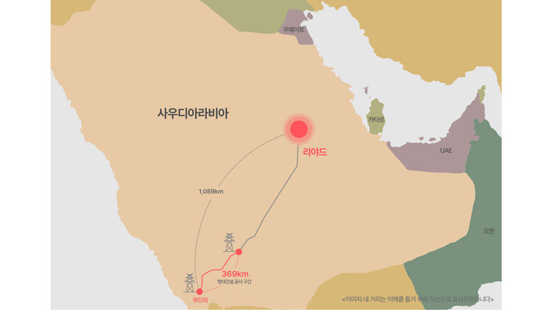 ‘리야드-쿠드미 송전선로 건설공사’는 리야드에 위치한 PP14(Combined Cycle Power Plant 14) 발전소에서 남부 해안의 쿠드미 지역을 잇는 총 1089㎞의 초고압직류송전선로를 구축하는 프로젝트다. 이 가운데 현대건설은 쿠드미 지역에 인접한 369㎞의 1구간을 담당하며, 완공 예정은 2027년 1월이다.