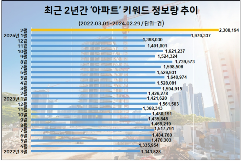지난해 12월만 해도 아파트 키워드 게시물 수는 139만여 건에 그쳤으나 다음달인 1월에는 197만여 건으로 갑자기 40.9%나 급증했으며, 지난달에는 230만 여건으로 지난해 12월 대비 65.1%나 폭증했다.